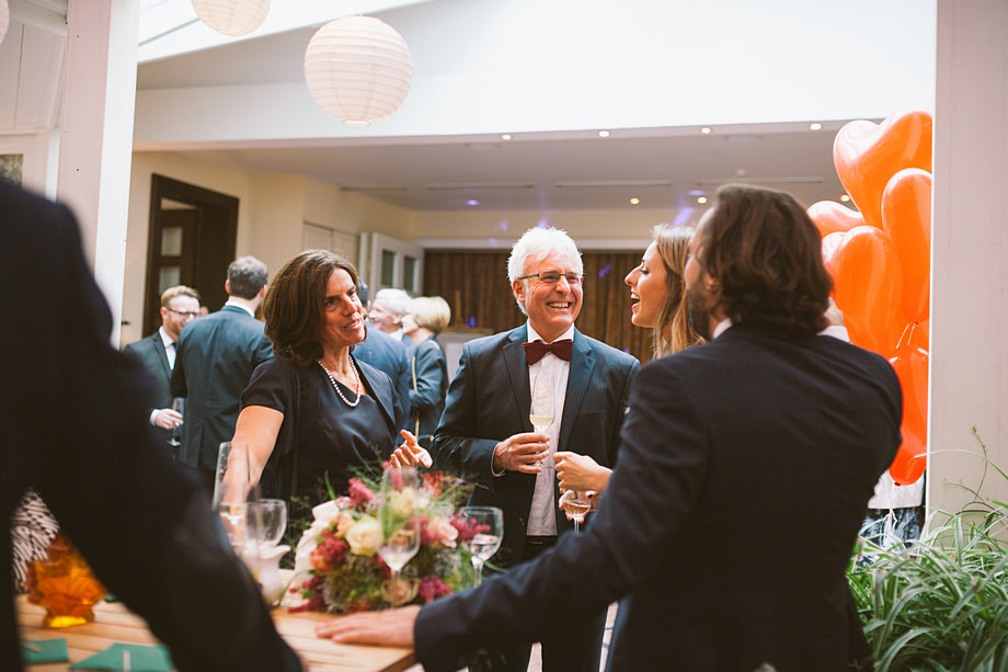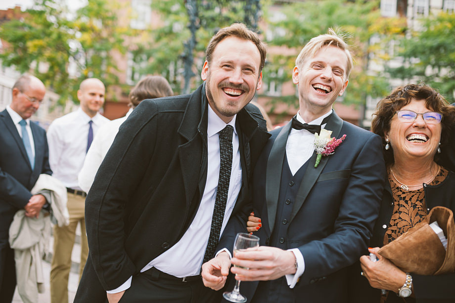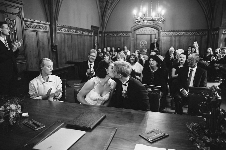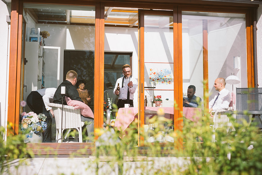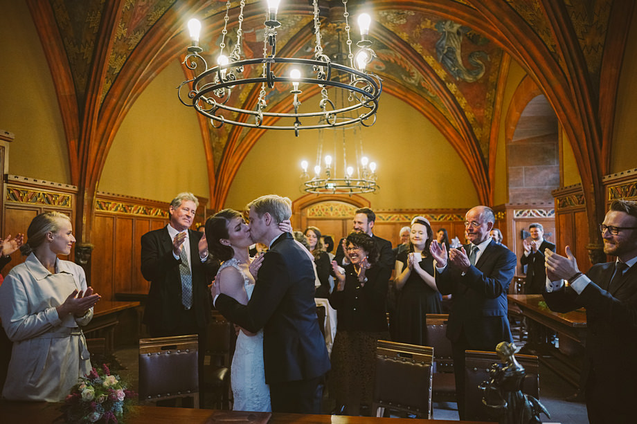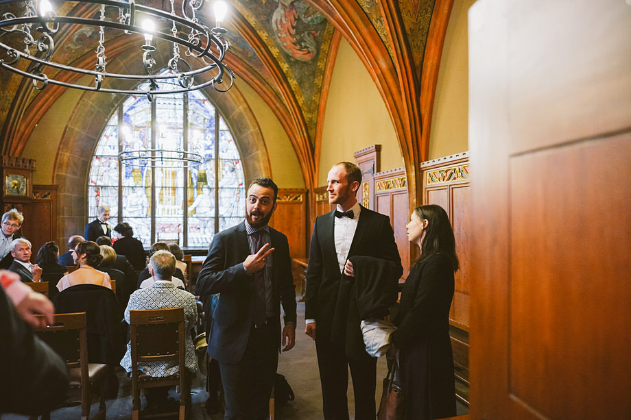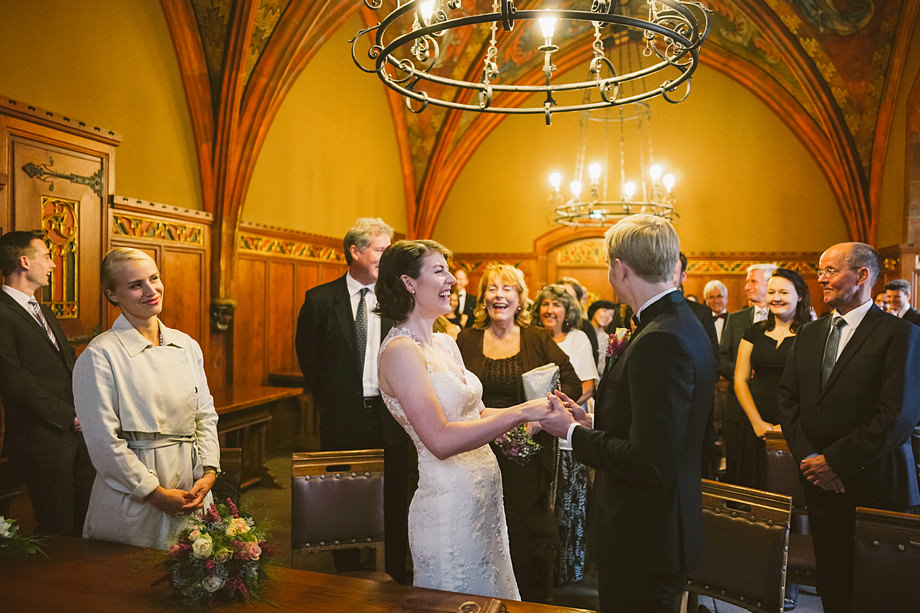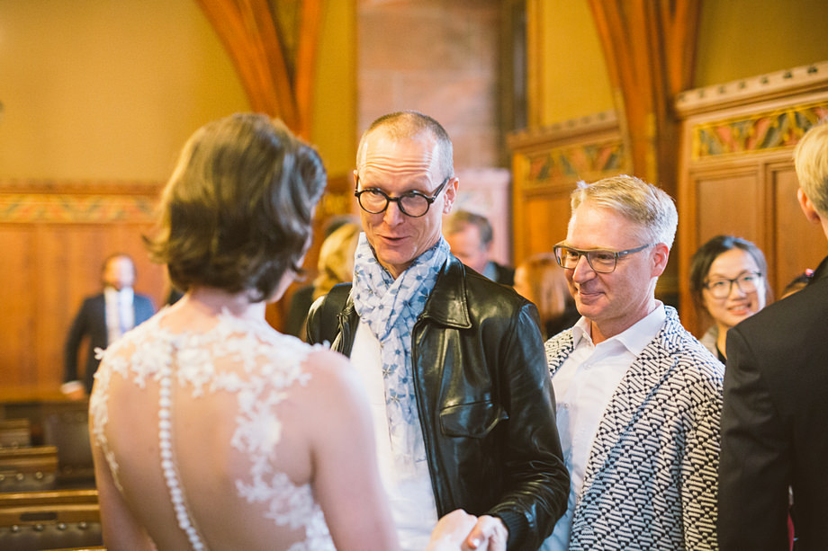 Die Trauung fand im schönen Standesamt direkt in der Innenstadt statt. Die Location kannten wir ja bereits, aber ich muss echt sagen, sehr hübsch für ein Standesamt. Die Zeit bis zur Trauung verbrachten wir wieder getrennt. Annette besuchte Elise in einem Hotel und ich war bei Andi. Hier herrschte dann richtig Betrieb. Gäste kamen, alle machten sich fertig, die Weizenbier-Temperatur wurde geprüft … da verging die Zeit doch ziemlich schnell 😉 Auch an diesem Tag mussten wir übrigens den deutsch-englisch Mix vollführen, da die Gäste ziemlich international waren. Total gut und immer lustig diese Situation.