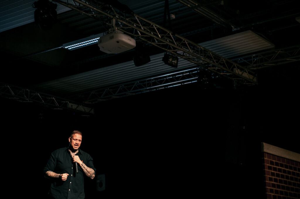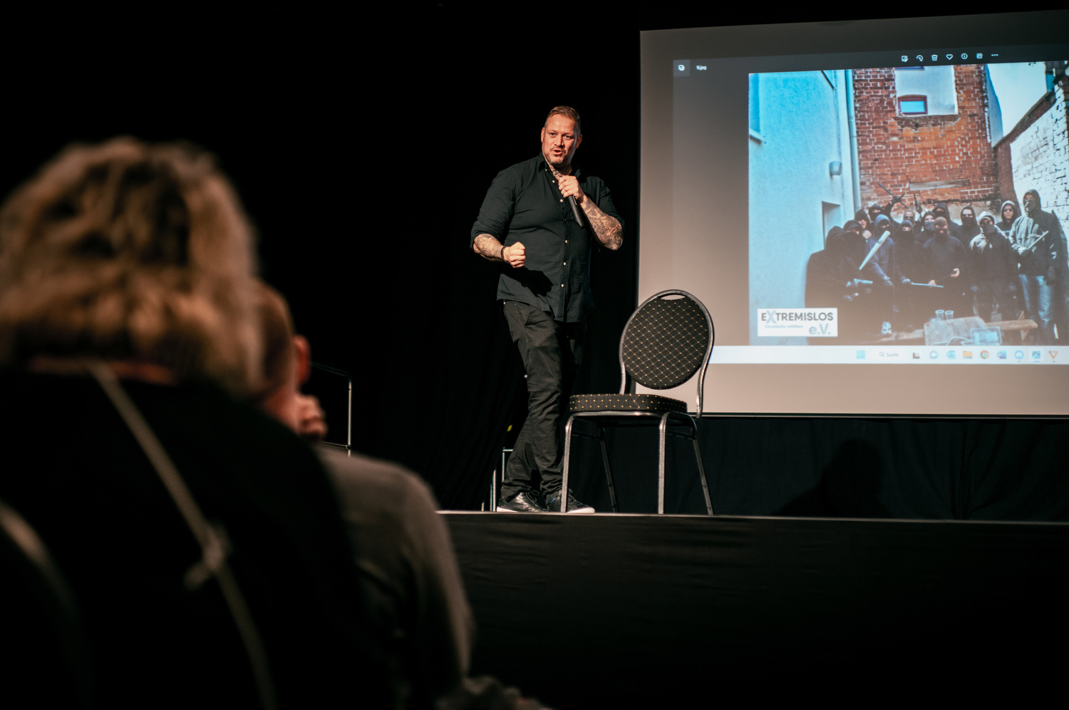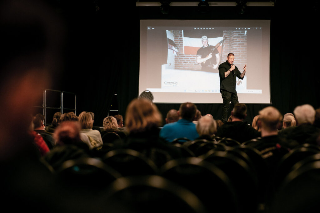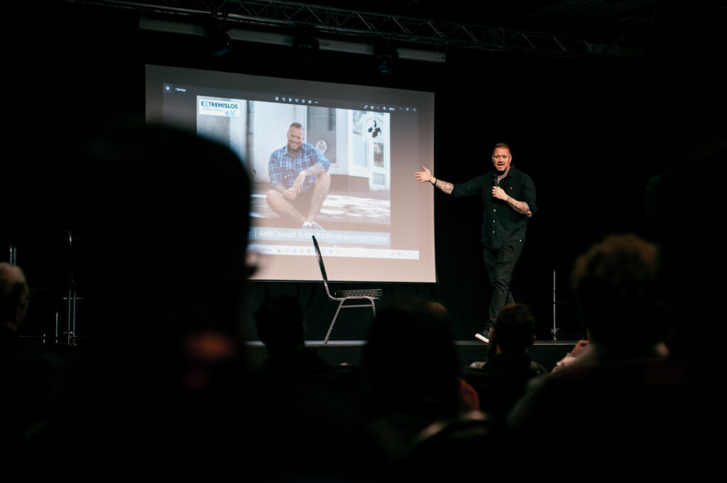 Heute ist er in der Präventionsarbeit tätig und hält als Anti-Gewalt- und Deradikalisierungstrainer Vorträge zu seinem Werdegang und wie man andere Menschen von diesem Weg abbringen kann. Das stieß hier in der Region auf soviel Interesse, dass zwei Events am Morgen mit je 400 Schülern direkt ausgebucht waren. Eine weitere fand gestern Abend statt für die Öffentlichkeit – hier waren auch nochmal um die 150 Menschen dabei.
